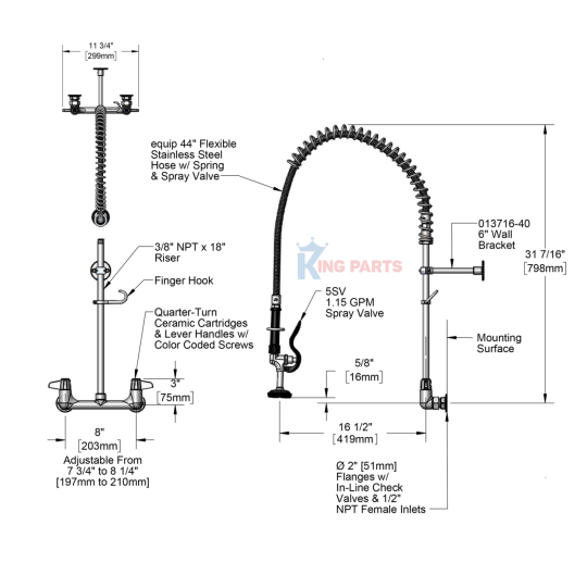 • Kiểu lắp: Gắn tường, khoảng cách tâm 8 inch (203.2 mm) – Lý tưởng cho các khu vực rửa cần tiết kiệm không gian bàn.
