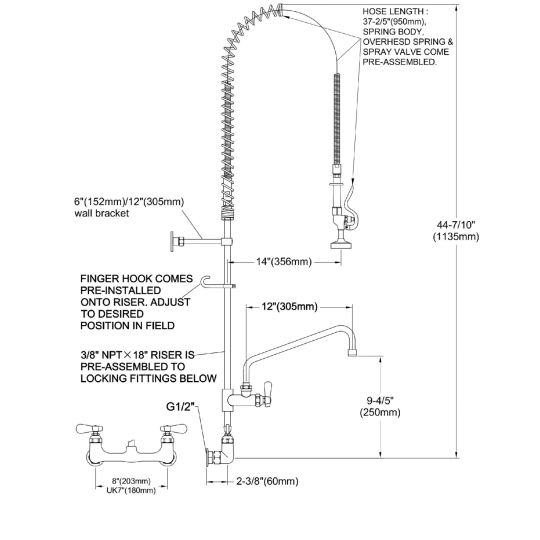 • Kiểu lắp: Gắn tường, khoảng cách tâm 8 inch (203 mm) – Phù hợp khu rửa bếp công nghiệp tiêu chuẩn